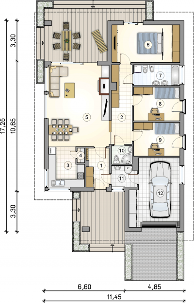 Das Projekt Pliszka IV ist ein Projekt für ein einstöckiges Haus in Holzrahmenbauweise. Das Haus ist in einen Wohn- und einen Nachtbereich unterteilt. Es besteht aus einem Wohnzimmer mit Kochnische, 3 Schlafzimmern, 2 Bädern und einer Garage mit Abstellraum.