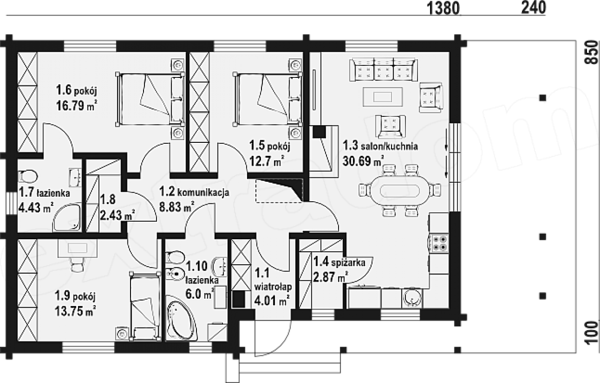 Opis projektu: Dom parterowy z bali drewnianych. Duży salon z aneksem kuchennym, kominkiem i wyjściem na duży zadaszony taras. Trzy pokoje, dwie łazienki, wiatrołap, spiżarka, komunikacja i schowek. Wyjście na poddasze schodami strychowymi rozkładanymi.Domy budujemy na podstawie indywidualnych projektów, powyższa oferta jest propozycją!