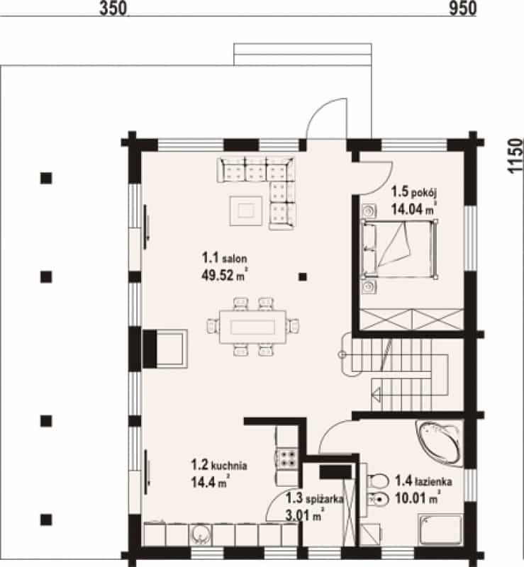 Dom z bali drewnianych. Podpiwniczony. Duży salon z aneksem kuchennym, kominkiem i wyjściami na zadaszony taras. Pokój, łazienka i spiżarka. Na poddaszu dwa pokoje, łazienka, komunikacja i antresola. W piwnicach garaż, kotłownia, piwnice i komunikacja.Domy budujemy na podstawie indywidualnych projektów, powyższa oferta jest propozycją!