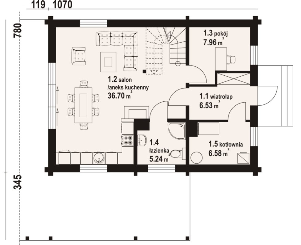 Dom z bali. Na parterze salon z aneksem kuchennym, wyjściem na taras i schodami na poddasze. Pokój, wiatrołap, kotłownia, łazienka. Na poddaszu cztery pokoje, łazienka, komunikacja, dwa balkony. Zwarta bryła budynku oraz dach dwuspadowy sprzyjają szybkiej i taniej budowie oraz niskim kosztom eksploatacjiDomy budujemy na podstawie indywidualnych projektów, powyższa oferta jest propozycją!