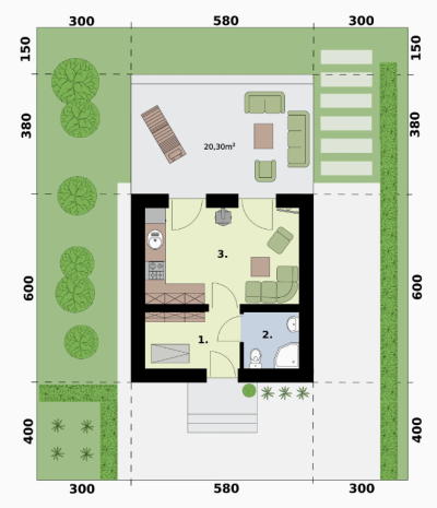 Opis projektu: Dom Lido 2c to propozycja małego domku, który zawiera wszystko. Idealnie nadaje się na niewielką działkę. Na parterze znajduje się wiatrołap, łazienka oraz salon z aneksem kuchennym. Projekt posiada antresolę, która może służyć jako sypialnia. Zaprojektowany został przestronny taras, idealny do wypoczywania w ciepłe, wakacyjne dni. Lido 2c może być idealnym projektem domu letniskowego na działkę.