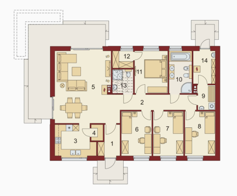 Projekt domu Domena 103 kierowany jest do Inwestorów, dla których priorytetem jest pełna wygoda użytkowania domu. Jest to budynek parterowy, dzięki czemu komunikacja między pomieszczeniami jest łatwa i komfortowa. Układ zlokalizowany na jednym poziomie szczególnie polecamy osobom z małymi dziećmi, starszym oraz mających kłopoty z poruszaniem się. Jednocześnie powierzchnia strychu jest na tyle duża, iż można zaadaptować go na użytkowy, jeśli w przyszłości zaszłaby taka potrzeba. Projekt Domena 103 charakteryzuje się typową bryłą, co znacznie ułatwia budowę oraz późniejszą aranżację wnętrza. Projekt ma usytuowaną kalenicę równolegle do drogi, co często określane jest w planie zagospodarowania przestrzennego. Dom został stworzony do zabudowy wolnostojącej i dobrze wpasuje się na działkę o średniej szerokości. Projekt można ponadto usytuować na granicy działki, co daje możliwość na realizację w zabudowie bliźniaczej. Konstrukcja domu przykryta jest dachem dwuspadowym, który jest jedną z najprostrzych i najtańszych form zadaszenia. Projekt domu charakteryzuje się przestronną strefą dzienną. Dużym plusem kuchni zamkniętej na salon jest wyraźny podział pomieszczeń. Dodatkowo, przy takim układzie unikniemy ciekawskich spojrzeń gości, co szczególnie sprawdzi się podczas przyjęć, w trakcie których nie zawsze mamy w niej idealny porządek. Projektant połączył salon i jadalnię w przestronną strefę dzienną, co jest nowoczesnym oraz bardzo funkcjonalnym rozwiązaniem. Usytuowany w salonie kominek nie tylko świetnie się prezentuje, ale także zapewni przyjemne ciepło w chłodniejsze dni. W projekcie przewidziano dwie łazienki - ta przy hallu doskonale sprawdzi się podczas odwiedzin gości, zaś łazienka obok sypialni przeznaczona jest dla domowników. Cztery sypialnie doskonale sprawdzą się w przypadku 3-5 osobowej rodziny. Co istotne, pokoje przeznaczone dla dzieci mają identyczne wymiary, co pozwoli na ich sprawiedliwy podział. W sypialni małżeńskiej przewidziano pojemną spiżarkę. W utrzymaniu porządku z pewnością pomoże nam przewidziane w projekcie pomieszczenia dodatkowe jak spiżarka, pralnia oraz schowek gospodarczy. Narożny taras prezentuje sie efektownie i sprzyja spędzaniu czasu na świeżym powietrzu.