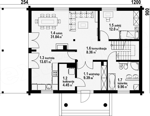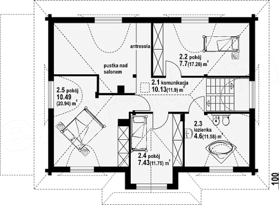 Projekt domu Chmielniki małe dw to ciekawa propozycja dla osób posiadających średniej szerokości działkę. Dom cechuje się prostą bryłą, więc jego realizacja nie pochłonie zbyt wielu środków finansowych. Projekt należy do kategorii domów z kalenicą skierowaną równolegle do drogi, co jest bardzo istotne, gdy wymagają tego warunki zabudowy. Kierowany jest do Inwestorów posiadających działkę pozwalającą na realizację projektu w zabudowie wolnostojącej. Projekt jest idealną propozycją dla osób zainteresowanych domem z dachem kopertowym, który charakteryzuje się dużą odpornością na działanie niesprzyjających warunków pogodowych. Uroku dodaje mu tzw. wole oko. Projekt Chmielniki małe dw to dom parterowy z poddaszem użytkowym, dzięki czemu mamy możliwość zagospodarowania większej powierzchni.