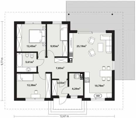 Efi wooden är ett projekt för ett fristående hus i en våning med optimala behov för en familj på 3-4 personer. Det är ett mycket funktionellt hus med en tydlig indelning i zoner. Det rymliga vardagsrummet är en enkel och klassisk kombination av vardagsrum, matsal och kök, medan den intima delen består av 3 sovrum och ett badrum. Huset har en stor terrass där du kan tillbringa tid utomhus oavsett väderlek. Ingången till huset går genom en liten arkad som skyddar mot regn och sol. Byggnadskroppen är sluten på en rektangulär projektion, täckt av ett sadeltak. Byggnaden är enkel att bygga och billig i drift.