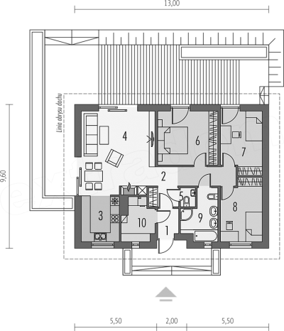 Huset har skapats för fristående bebyggelse. Projektet kan placeras på tomtgränsen, vilket gör det möjligt att förverkliga det som ett parhus. Husets struktur är täckt med ett sadeltak, och byggandet av takbjälklaget och dess täckning är ekonomiskt och tar inte mycket tid. Kornel V energo-projektet är ett envåningshus, vilket är en stor fördel för äldre, funktionshindrade och par med små barn. Husets design kännetecknas av ett rymligt vardagsrum. Det öppna köket är en idealisk plats för att träffa familj och vänner. Huset har en matsal i anslutning till vardagsrummet. Den här lösningen ger många möjligheter att ordna bostadsområdet. Vardagsrummet har en stämningsfull öppen spis som ger en behaglig värme och atmosfär till inredningen. Projektets författare har tänkt sig både ett badrum och en separat toalett, vilket är särskilt användbart för ett större antal hushållsmedlemmar. Tre bekväma rum uppfyller behoven hos en familj med 2-4 personer. Utrymmet kan också användas som gästrum eller arbetsrum. En utmärkt plats att koppla av på är en terrass som huset har utformat. Projektet skapades för investerare som planerar att bygga ett hus i tegelteknik. Dess yttre utseende framhäver den moderna stilens egenskaper, vilket är en idealisk lösning för dem som uppskattar de senaste lösningarna i husets stil.