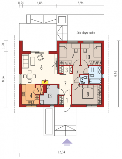 Yttre mått: 12,34 x 9,64 x 5,89 m.