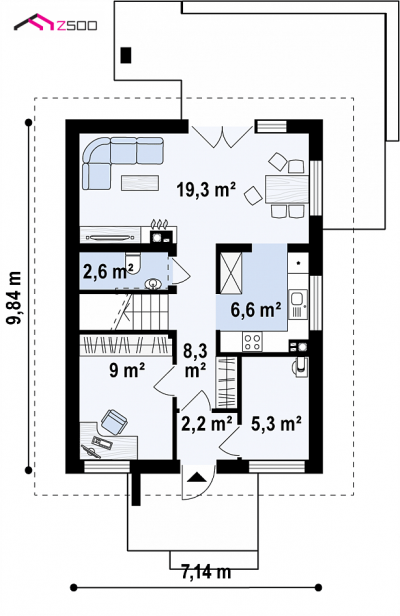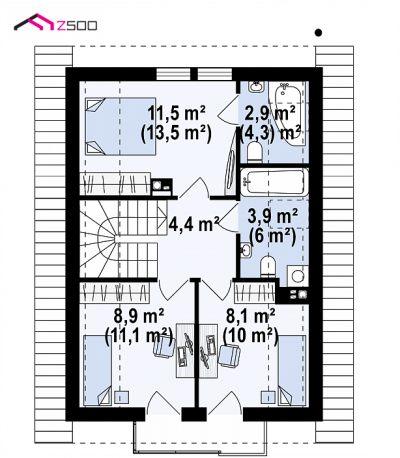 Z177 D är ett projekt för ett hus med en användbar vind. Den enkla, välformade kroppen, sadeltaket och den intressanta ytbehandlingen av fasaden ger den ett distinkt utseende. Bottenvåningen nås genom en täckt ingång direkt in i hallen. Till höger finns en tvättstuga. Vidare finns det en lång korridor från vilken man kan gå till arbetsrummet, toaletten, trappan och vardagsrummet som är kopplat till matsalen och delvis till köket. Första våningen är husägarnas privata område. Här finns ett stort sovrum med separat badrum, två sovrum, vart och ett med separat utgång till balkongen, och ett gemensamt badrum.Projekt Z177 D kommer att tilltala dem som söker ett bekvämt och praktiskt hus.