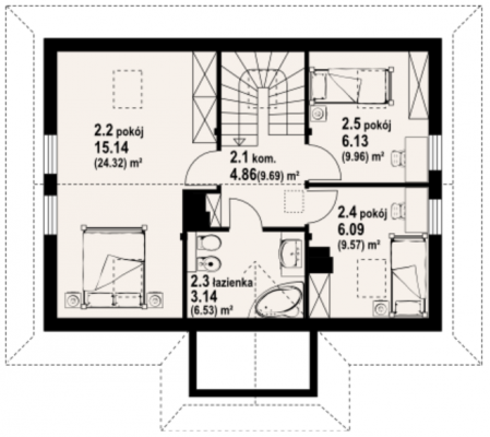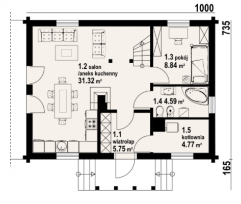 Timmerhus i timmer . Det yttre utseendet är en hänvisning till traditionen för höglandshus, medan den funktionella utformningen inuti är modern. 5 rum, 2 badrum, pannrum. Vardagsrum med pentry, öppen spis, trappor till vinden och tillgång till terrassen. Rum, badrum, förrum, pannrum. På vinden finns 3 rum och ett badrum. Bostadshus som också kan vara ett semesterhus