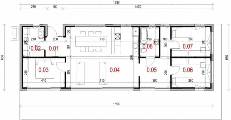 Den största fördelen med det här projektet är att det ljusa vardagsrummet är sammankopplat med matsalen och köket och att öppningen mot gaveln skapar ett mycket stort utrymme. Huset har 3 sovrum, ett badrum, ett tvättstuga och en stor hall.