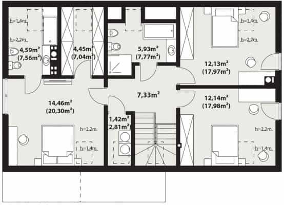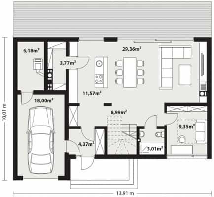 Kiri träprojekt är ett envåningshus med en användbar vind med modern form och funktionell, rymlig interiör. Utformad i timmerramsteknik. Den kommer säkert att tilltala människor som föredrar okonventionella lösningar. Byggnadens enkla stomme med ett sadeltak utan takfot har varierats med glas som ger ljushet. Den sofistikerade designen uppnåddes genom subtila detaljer och kontrasten mellan två material - antracitfärgade fasadplattor som efterliknar tegel och varmfärgad träbeklädnad. En av fördelarna med Kiri House-projektet är ett intressant, öppet vardagsrum som är mycket väl upplyst tack vare stora glaspartier. Genom att placera kök, vardagsrum och matsal på detta sätt verkar de ännu större, och landskapet utanför blir en oumbärlig del av inredningen. Matlagningsentusiaster kommer säkert att älska det bekväma, moderna köket som kompletteras av ett praktiskt, stort skafferi. Det funktionella programmet på bottenvåningen kompletteras ytterligare av ett arbetsrum, ett badrum, ett stort pannrum och ett garage för en bil. En bred, bekväm trappa leder till vinden där det finns 3 sovrum. Det största av dem har ett eget badrum och ett omklädningsrum. Den funktionella helheten på vinden kompletteras av ett gemensamt badrum och en tvättstuga. Project Kiri wooden är ett idealiskt förslag för en familj på 4-5 personer som uppskattar byggnadens eleganta, moderna utseende och sofistikerade stil.